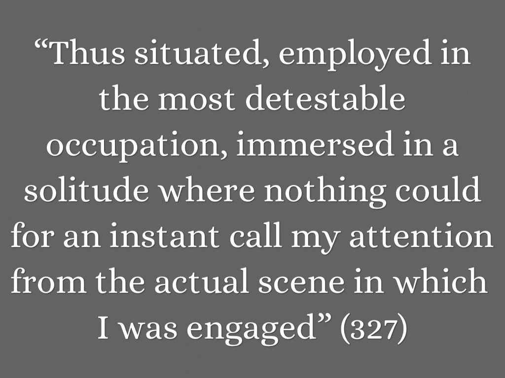 “Thus situated, employed in the most detestable occupation, immersed in a solitude where nothing could for an instant call my attention from the actual scene in which I was engaged” (327)