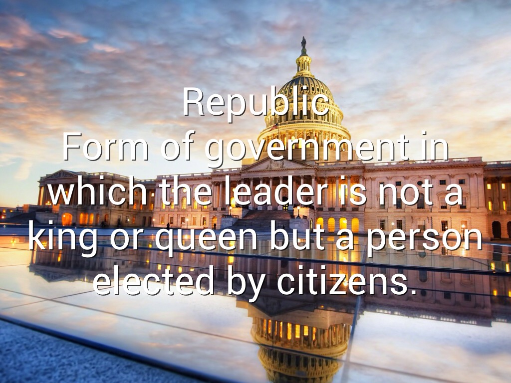 Form of government in which the leader is not a king or queen but a person elected by citizens.