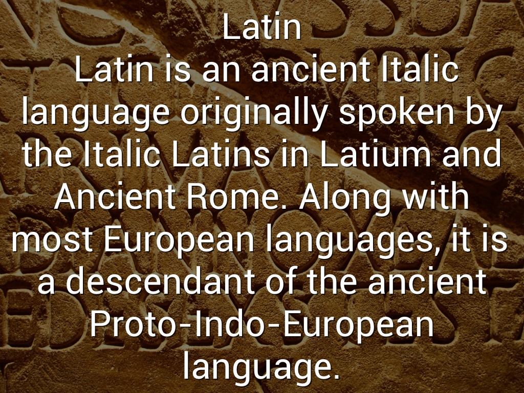 Latin is an ancient Italic language originally spoken by the Italic Latins in Latium and Ancient Rome. Along with most European languages, it is a descendant of the ancient Proto-Indo-European language.