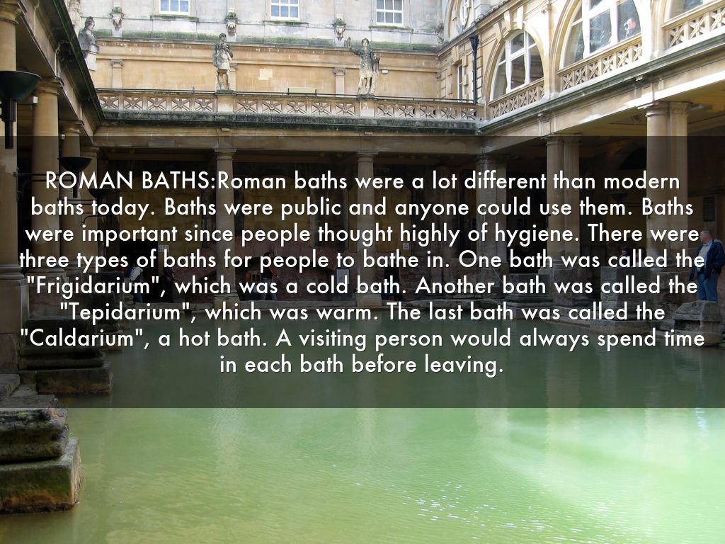 ROMAN BATHS:Roman baths were a lot different than modern baths today. Baths were public and anyone could use them. Baths were important since people thought highly of hygiene. There were three types of baths for people to bathe in. One bath was called the "Frigidarium", which was a cold bath. Another bath was called the "Tepidarium", which was warm. The last bath was called the "Caldarium", a hot bath. A visiting person would always spend time in each bath before leaving.