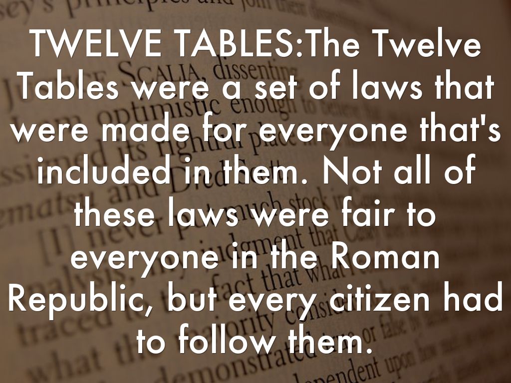 TWELVE TABLES:The Twelve Tables were a set of laws that were made for everyone that's included in them. Not all of these laws were fair to everyone in the Roman Republic, but every citizen had to follow them.