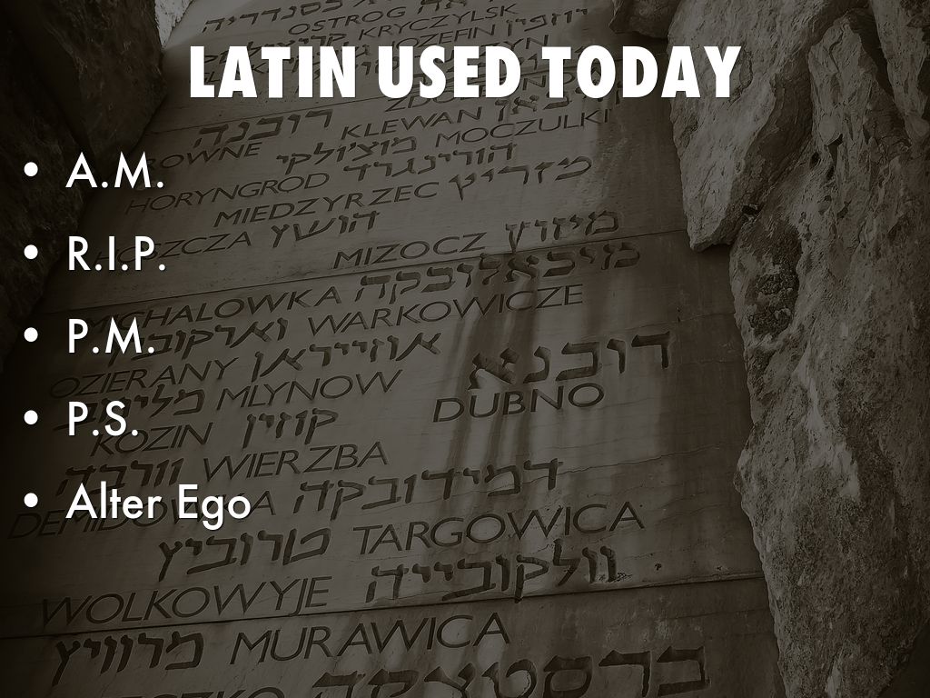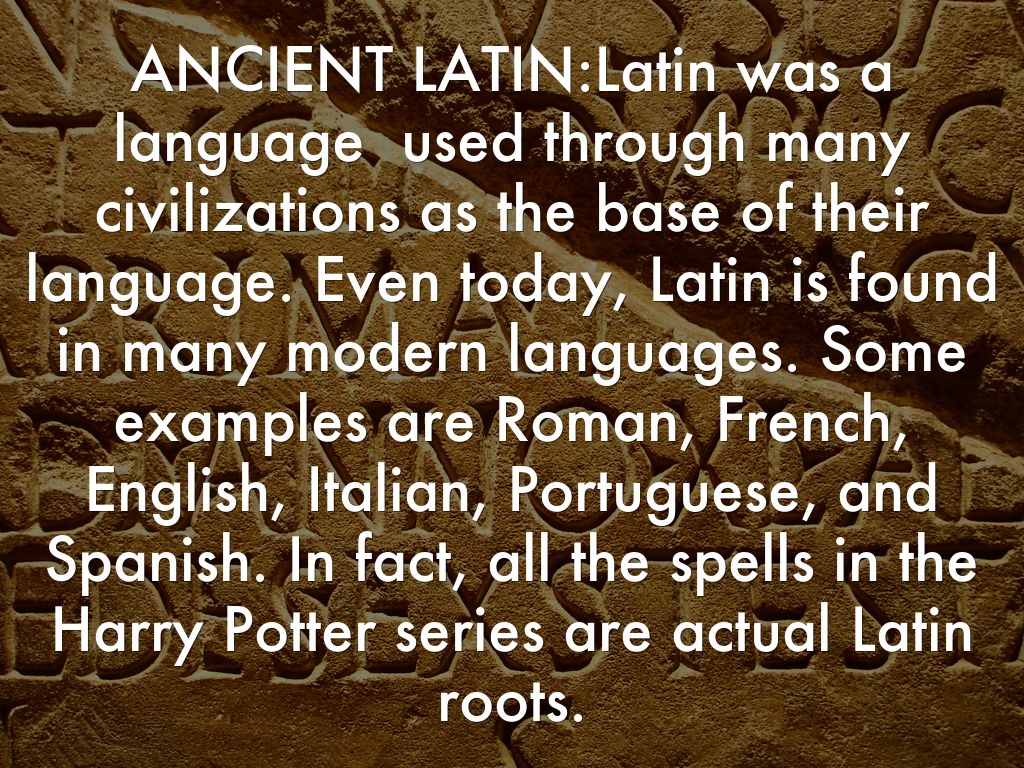 ANCIENT LATIN:Latin was a language used through many civilizations as the base of their language. Even today, Latin is found in many modern languages. Some examples are Roman, French, English, Italian, Portuguese, and Spanish. In fact, all the spells in the Harry Potter series are actual Latin roots.