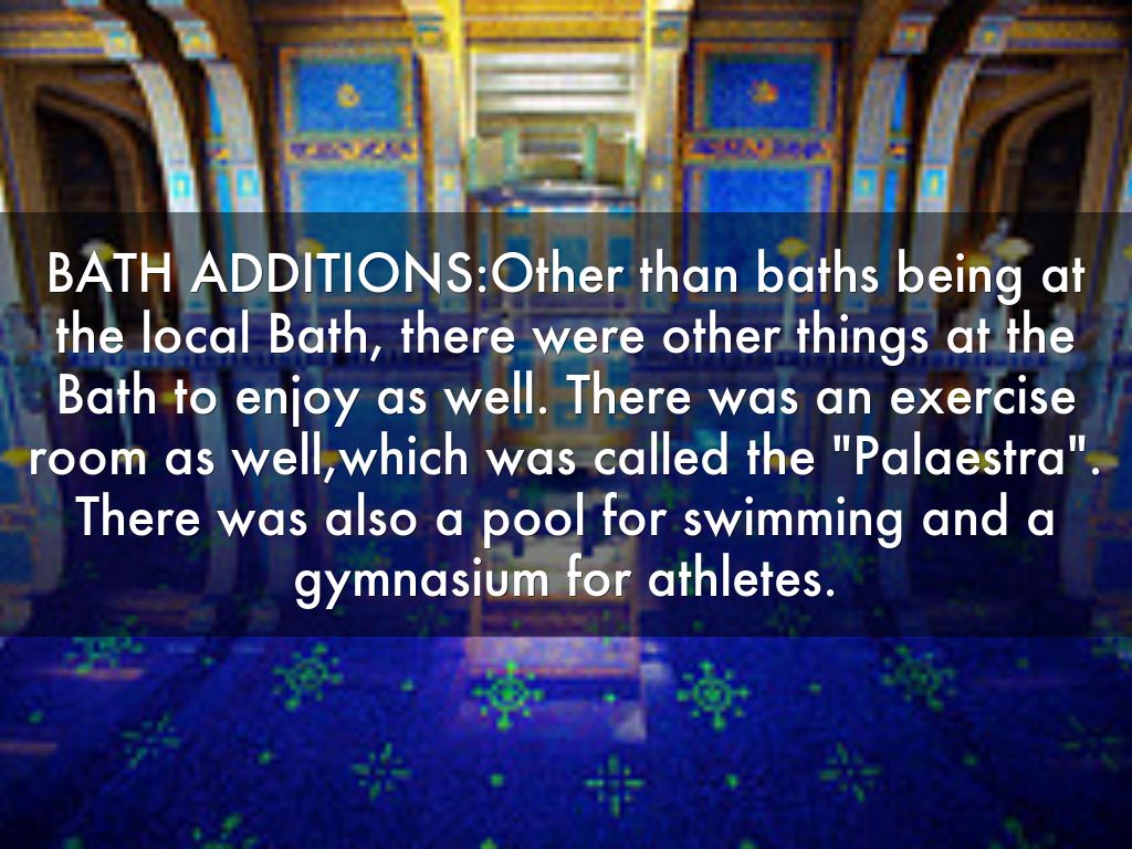 BATH ADDITIONS:Other than baths being at the local Bath, there were other things at the Bath to enjoy as well. There was an exercise room as well,which was called the "Palaestra". There was also a pool for swimming and a gymnasium for athletes.