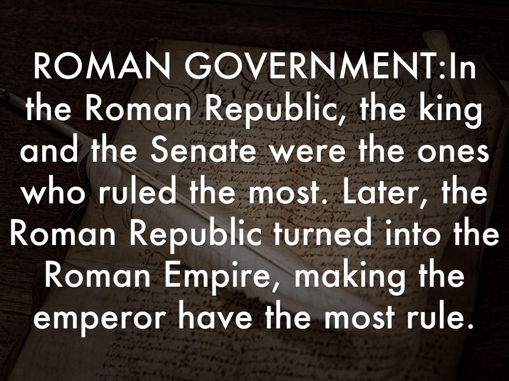 ROMAN GOVERNMENT:In the Roman Republic, the king and the Senate were the ones who ruled the most. Later, the Roman Republic turned into the Roman Empire, making the emperor have the most rule.