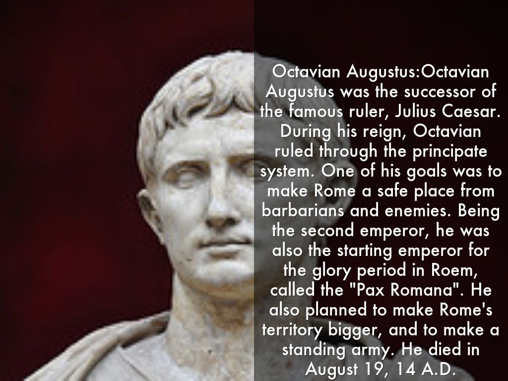 Octavian Augustus:Octavian Augustus was the successor of the famous ruler, Julius Caesar. During his reign, Octavian ruled through the principate system. One of his goals was to make Rome a safe place from barbarians and enemies. Being the second emperor, he was also the starting emperor for the glory period in Roem, called the "Pax Romana". He also planned to make Rome's territory bigger, and to make a standing army. He died in August 19, 14 A.D.