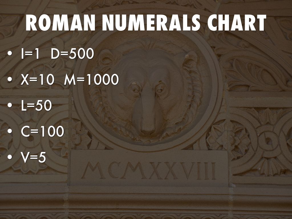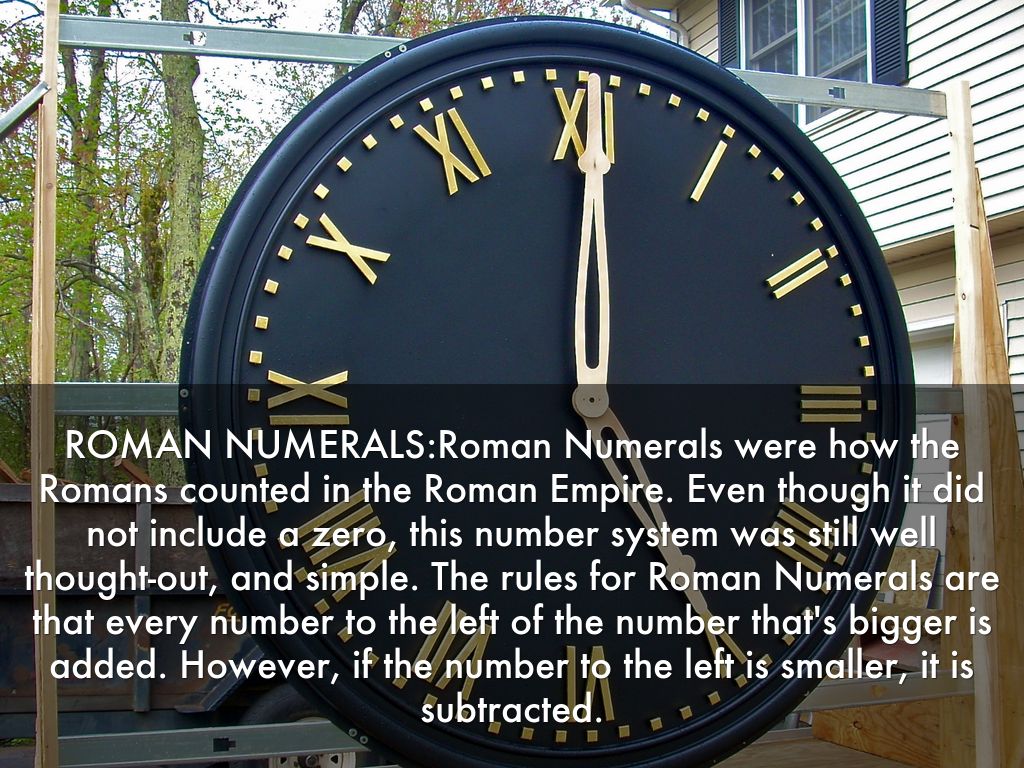 ROMAN NUMERALS:Roman Numerals were how the Romans counted in the Roman Empire. Even though it did not include a zero, this number system was still well thought-out, and simple. The rules for Roman Numerals are that every number to the left of the number that's bigger is added. However, if the number to the left is smaller, it is subtracted.