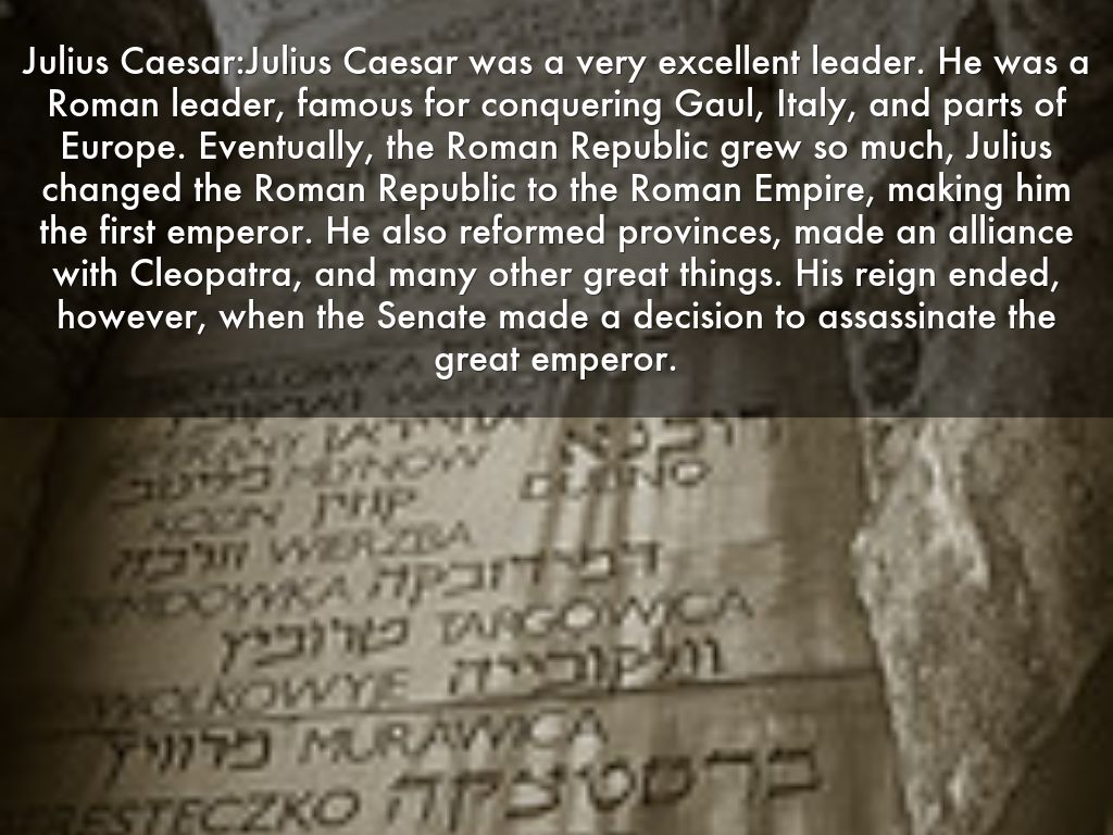 Julius Caesar:Julius Caesar was a very excellent leader. He was a Roman leader, famous for conquering Gaul, Italy, and parts of Europe. Eventually, the Roman Republic grew so much, Julius changed the Roman Republic to the Roman Empire, making him the first emperor. He also reformed provinces, made an alliance with Cleopatra, and many other great things. His reign ended, however, when the Senate made a decision to assassinate the great emperor.