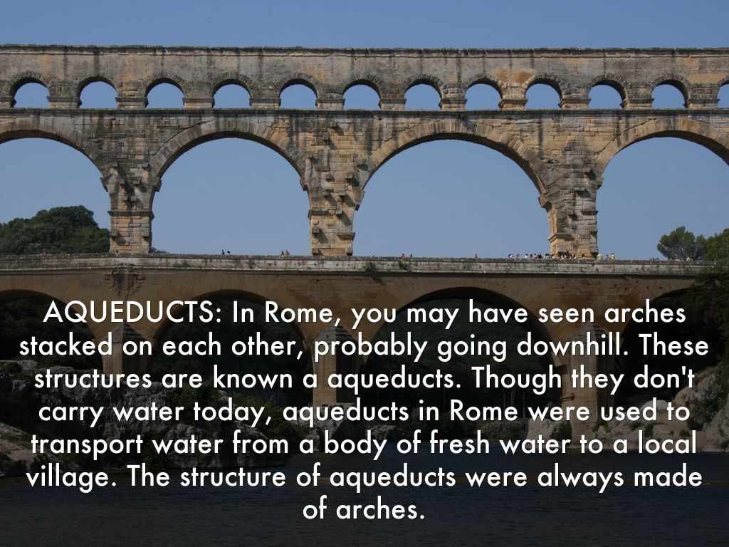 AQUEDUCTS: In Rome, you may have seen arches stacked on each other, probably going downhill. These structures are known a aqueducts. Though they don't carry water today, aqueducts in Rome were used to transport water from a body of fresh water to a local village. The structure of aqueducts were always made of arches.