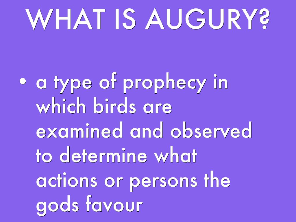 a type of prophecy in which birds are examined and observed to determine what actions or persons the gods favour