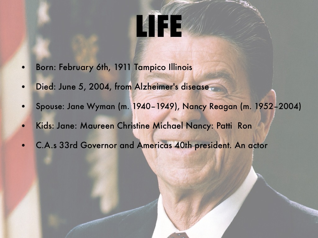 • Spouse: Jane Wyman (m. 1940–1949), Nancy Reagan (m. 1952–2004)