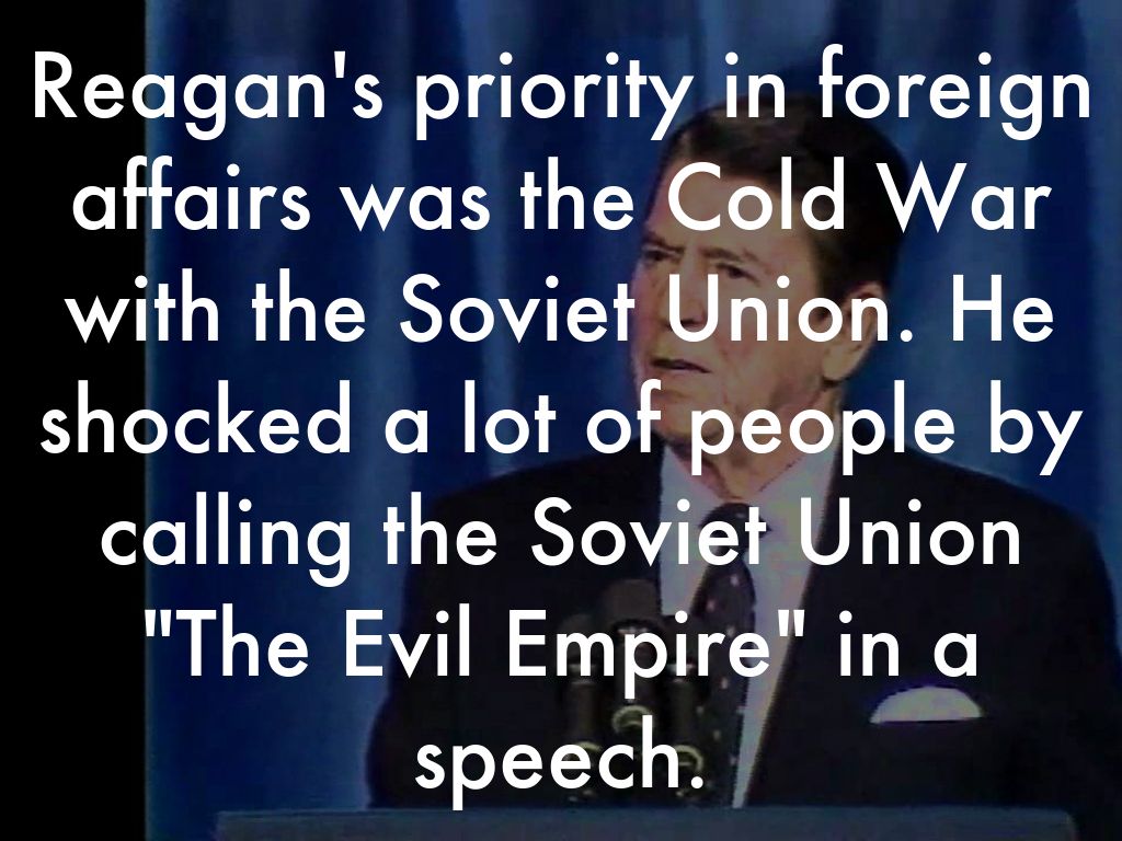 Reagan's priority in foreign affairs was the Cold War with the Soviet Union. He shocked a lot of people by calling the Soviet Union "The Evil Empire" in a speech.
