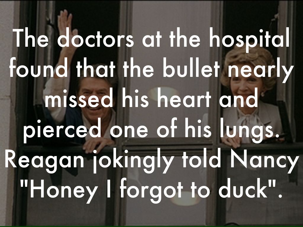 The doctors at the hospital found that the bullet nearly missed his heart and pierced one of his lungs. Reagan jokingly told Nancy "Honey I forgot to duck".