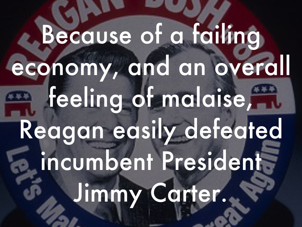 Because of a failing economy, and an overall feeling of malaise, Reagan easily defeated incumbent President Jimmy Carter.