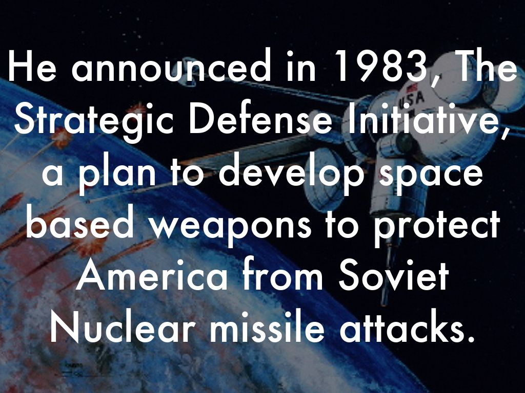 He announced in 1983, The Strategic Defense Initiative, a plan to develop space based weapons to protect America from Soviet Nuclear missile attacks.