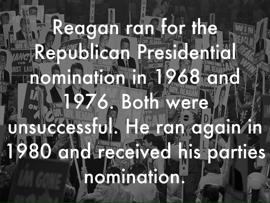 Reagan ran for the Republican Presidential nomination in 1968 and 1976. Both were unsuccessful. He ran again in 1980 and received his parties nomination.