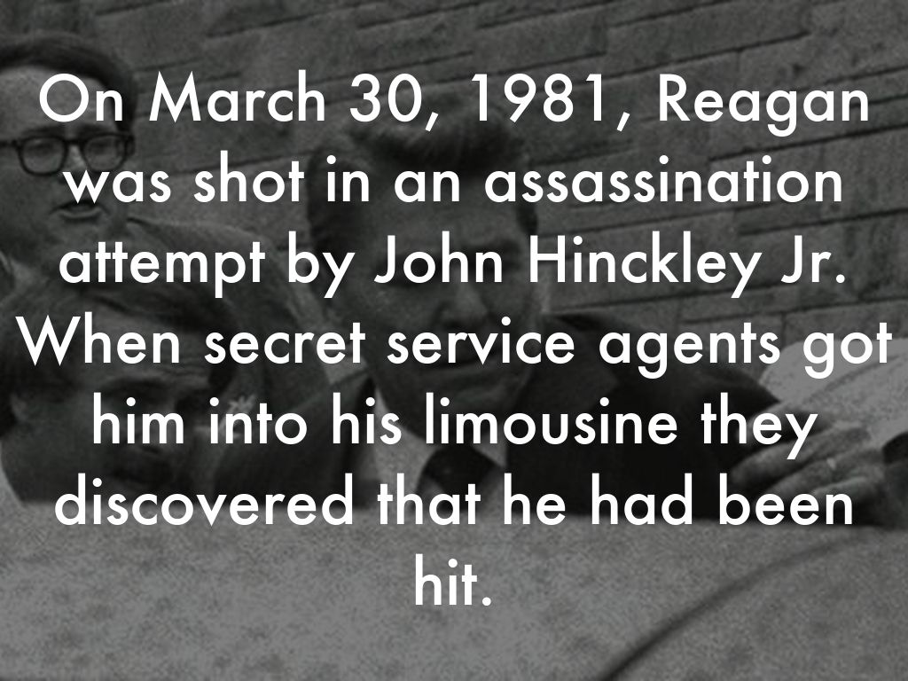 On March 30, 1981, Reagan was shot in an assassination attempt by John Hinckley Jr. When secret service agents got him into his limousine they discovered that he had been hit.