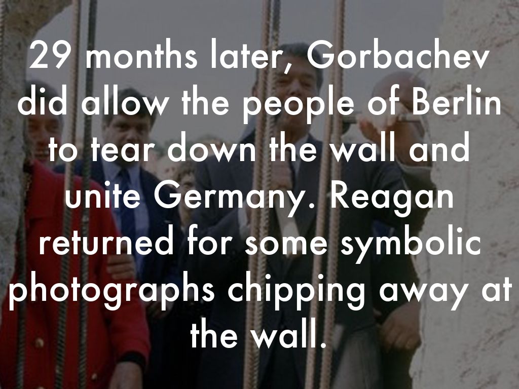 29 months later, Gorbachev did allow the people of Berlin to tear down the wall and unite Germany. Reagan returned for some symbolic photographs chipping away at the wall.