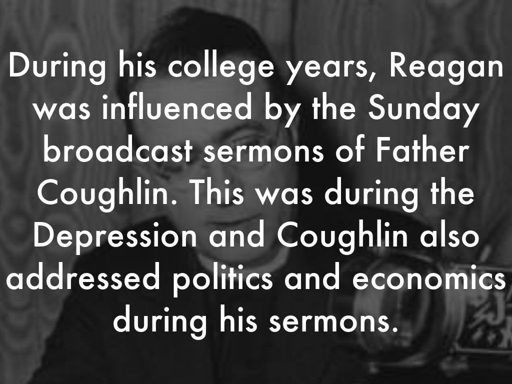 During his college years, Reagan was influenced by the Sunday broadcast sermons of Father Coughlin. This was during the Depression and Coughlin also addressed politics and economics during his sermons.