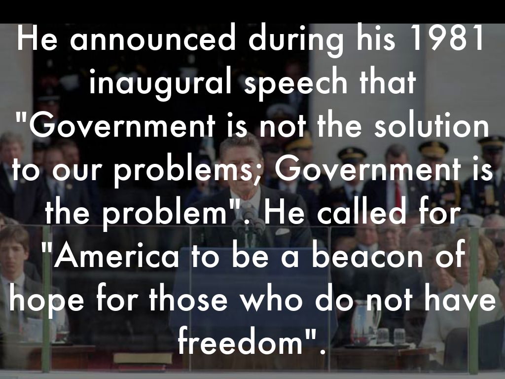 He announced during his 1981 inaugural speech that "Government is not the solution to our problems; Government is the problem". He called for "America to be a beacon of hope for those who do not have freedom".
