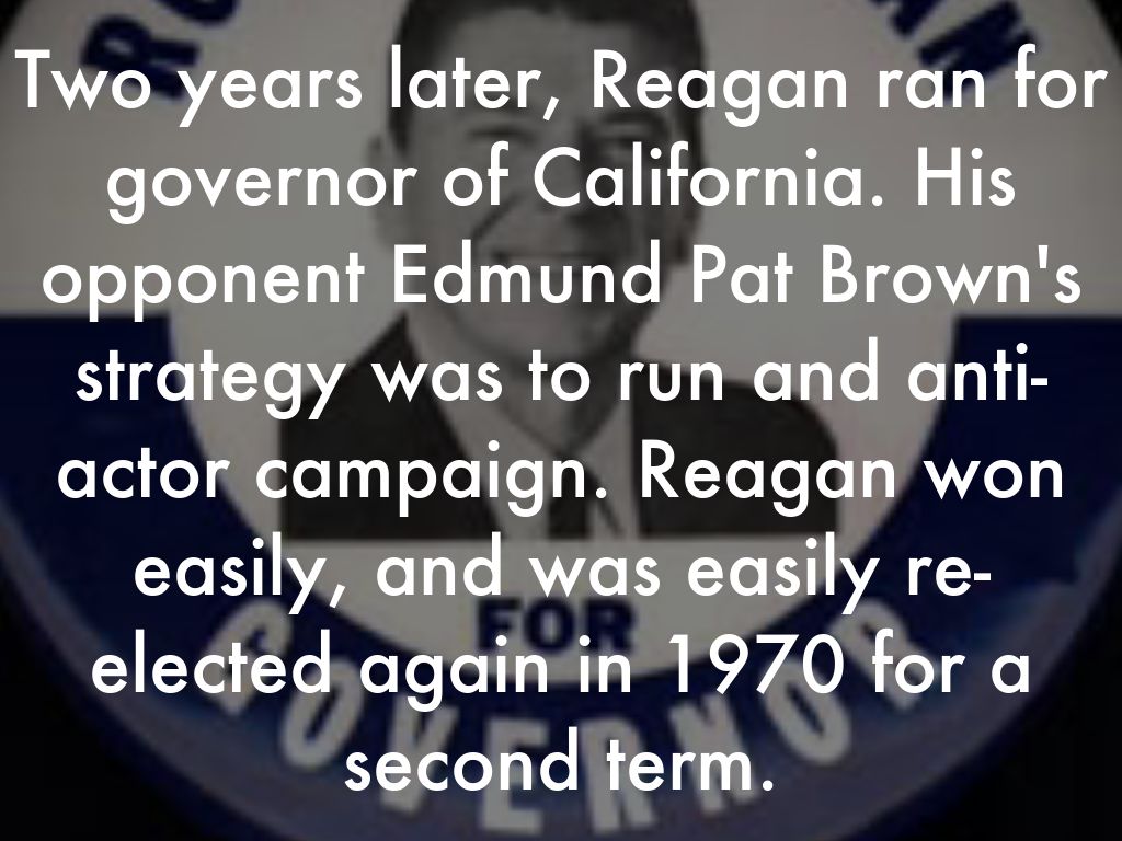 Two years later, Reagan ran for governor of California. His opponent Edmund Pat Brown's strategy was to run and anti-actor campaign. Reagan won easily, and was easily re-elected again in 1970 for a second term.