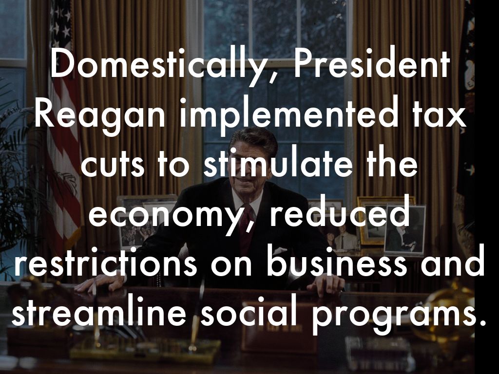 Domestically, President Reagan implemented tax cuts to stimulate the economy, reduced restrictions on business and streamline social programs.