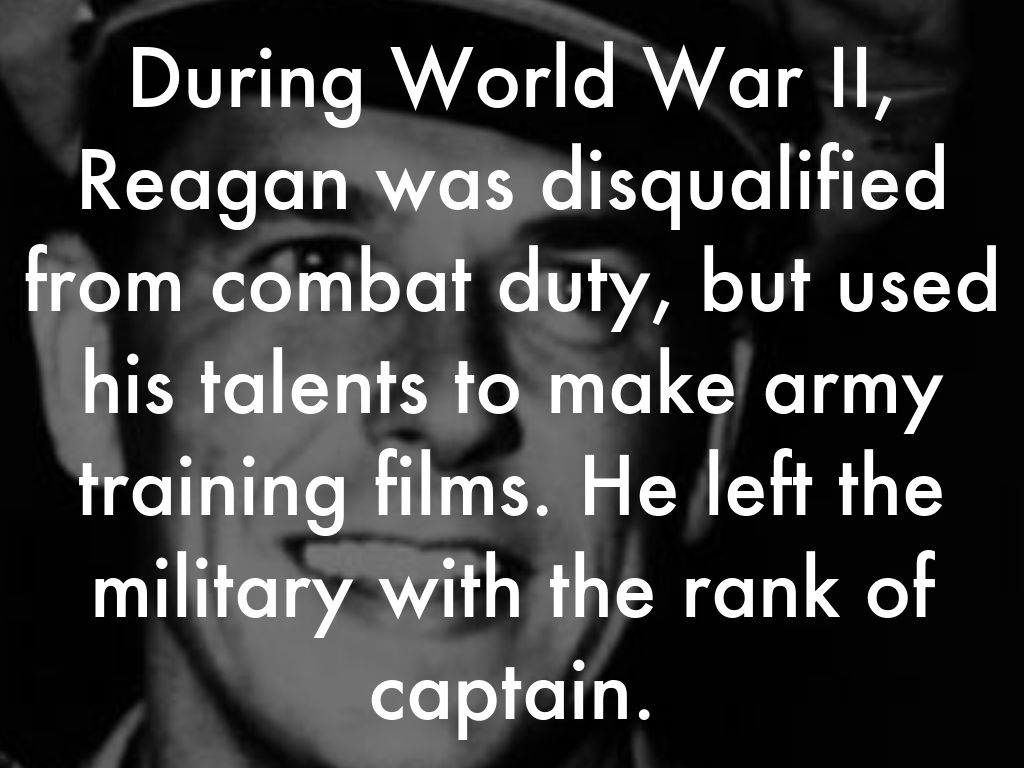 During World War II, Reagan was disqualified from combat duty, but used his talents to make army training films. He left the military with the rank of captain.