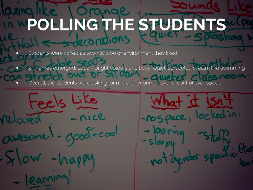 • 2 Themes emerged: Loud - Bright colours and busy, Quiet: soft colours, calm like swimming
