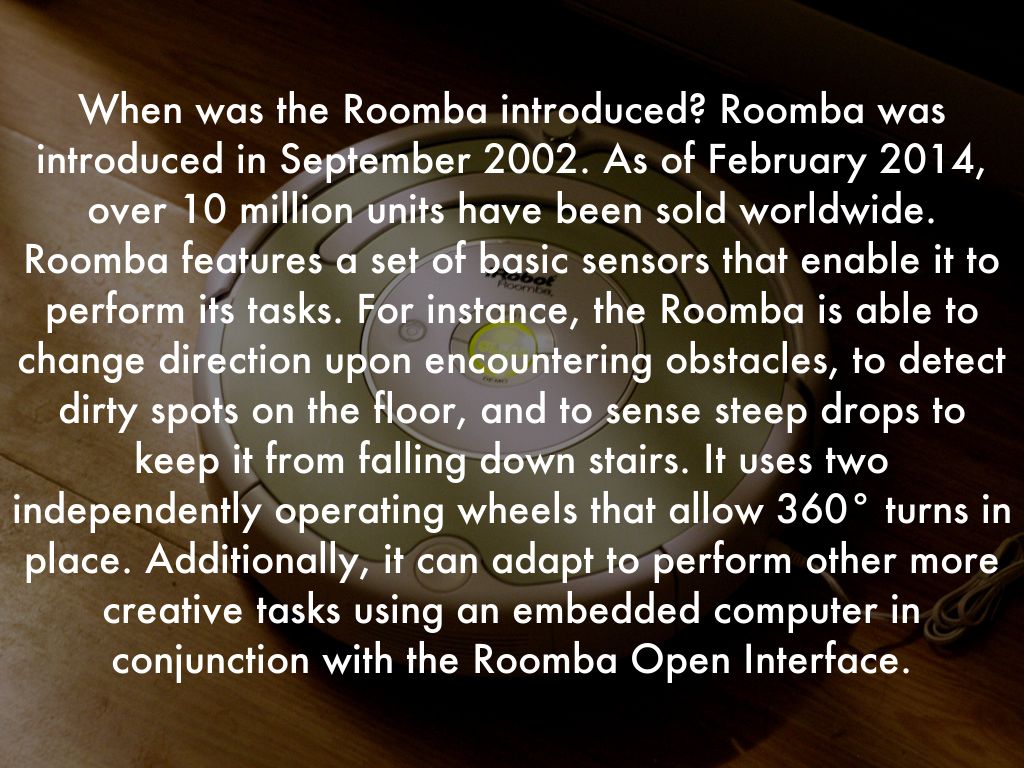 When was the Roomba introduced? Roomba was introduced in September 2002. As of February 2014, over 10 million units have been sold worldwide. Roomba features a set of basic sensors that enable it to perform its tasks. For instance, the Roomba is able to change direction upon encountering obstacles, to detect dirty spots on the floor, and to sense steep drops to keep it from falling down stairs. It uses two independently operating wheels that allow 360° turns in place. Additionally, it can adapt to perform other more creative tasks using an embedded computer in conjunction with the Roomba Open Interface.