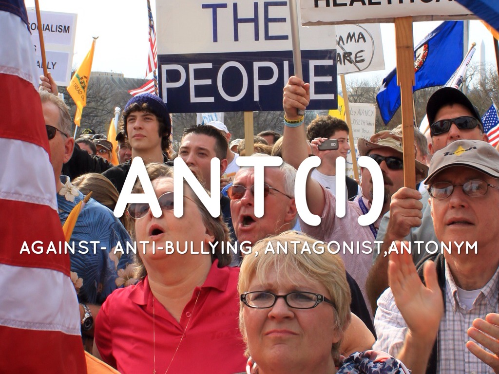 AGAINST- ANTI-BULLYING, ANTAGONIST,ANTONYM