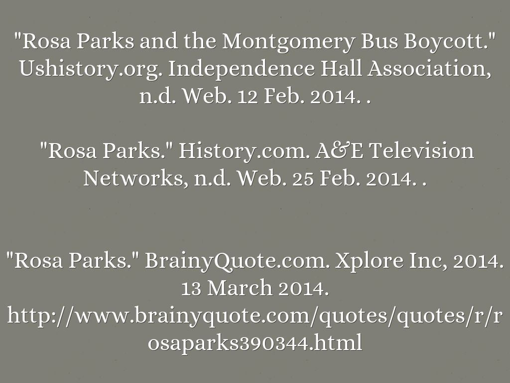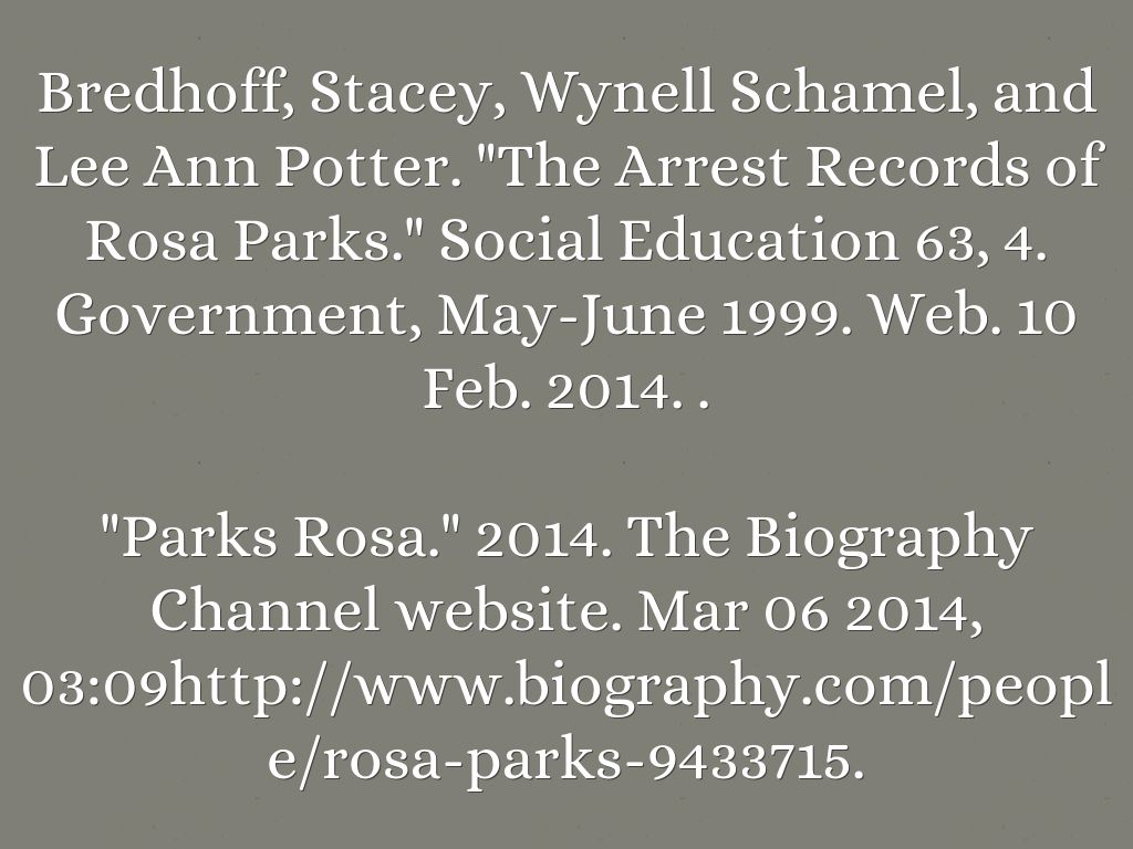 Bredhoff, Stacey, Wynell Schamel, and Lee Ann Potter. "The Arrest Records of Rosa Parks." Social Education 63, 4. Government, May-June 1999. Web. 10 Feb. 2014. .