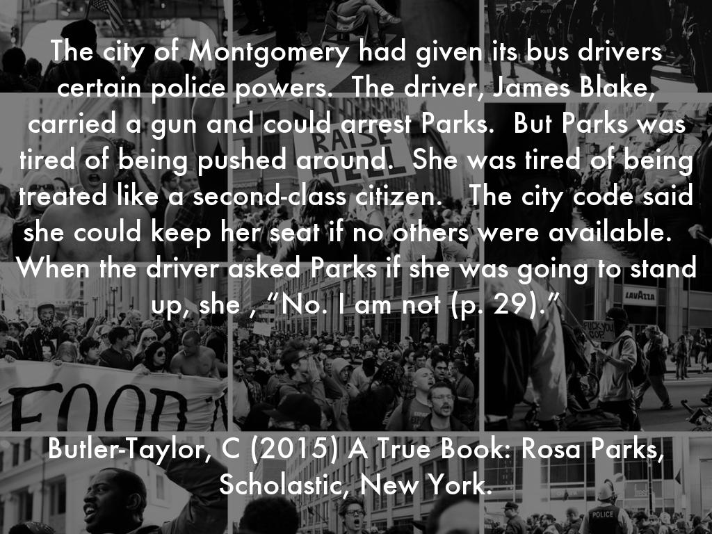 The city of Montgomery had given its bus drivers certain police powers. The driver, James Blake, carried a gun and could arrest Parks. But Parks was tired of being pushed around. She was tired of being treated like a second-class citizen. The city code said she could keep her seat if no others were available. When the driver asked Parks if she was going to stand up, she , “No. I am not (p. 29).”