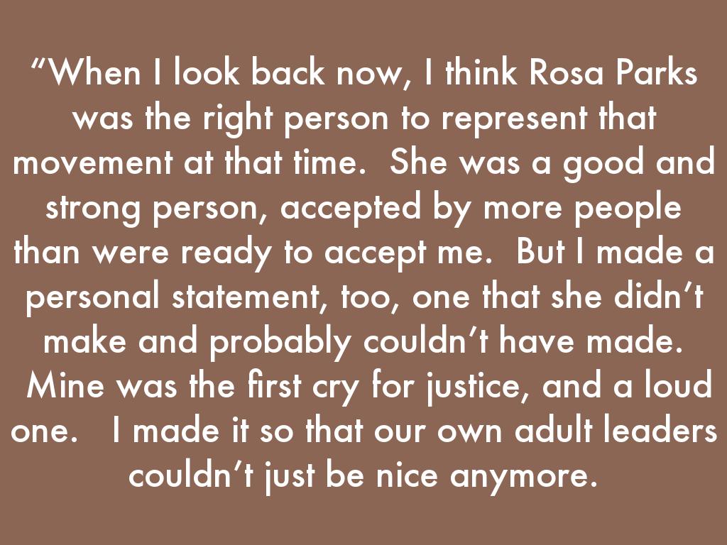 “When I look back now, I think Rosa Parks was the right person to represent that movement at that time. She was a good and strong person, accepted by more people than were ready to accept me. But I made a personal statement, too, one that she didn’t make and probably couldn’t have made. Mine was the first cry for justice, and a loud one. I made it so that our own adult leaders couldn’t just be nice anymore.