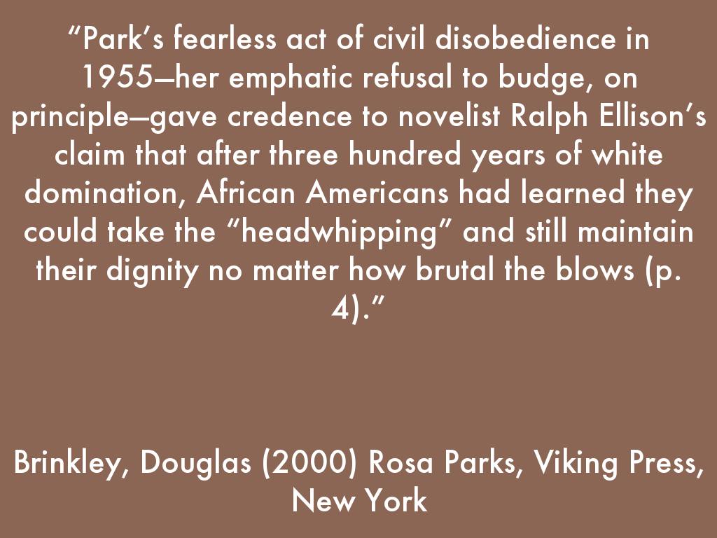 “Park’s fearless act of civil disobedience in 1955—her emphatic refusal to budge, on principle—gave credence to novelist Ralph Ellison’s claim that after three hundred years of white domination, African Americans had learned they could take the “headwhipping” and still maintain their dignity no matter how brutal the blows (p. 4).”