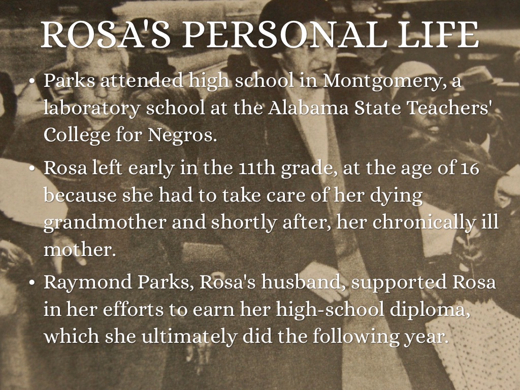 • Raymond Parks, Rosa's husband, supported Rosa in her efforts to earn her high-school diploma, which she ultimately did the following year.