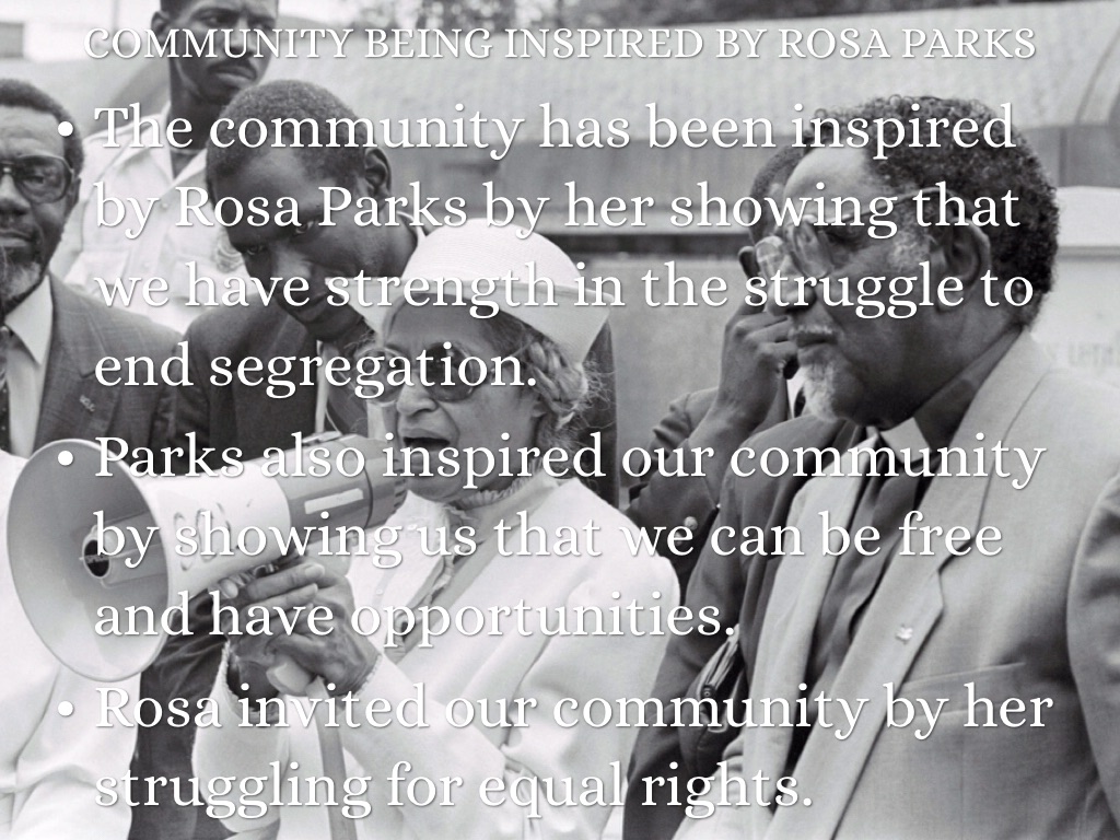 • The community has been inspired by Rosa Parks by her showing that we have strength in the struggle to end segregation.