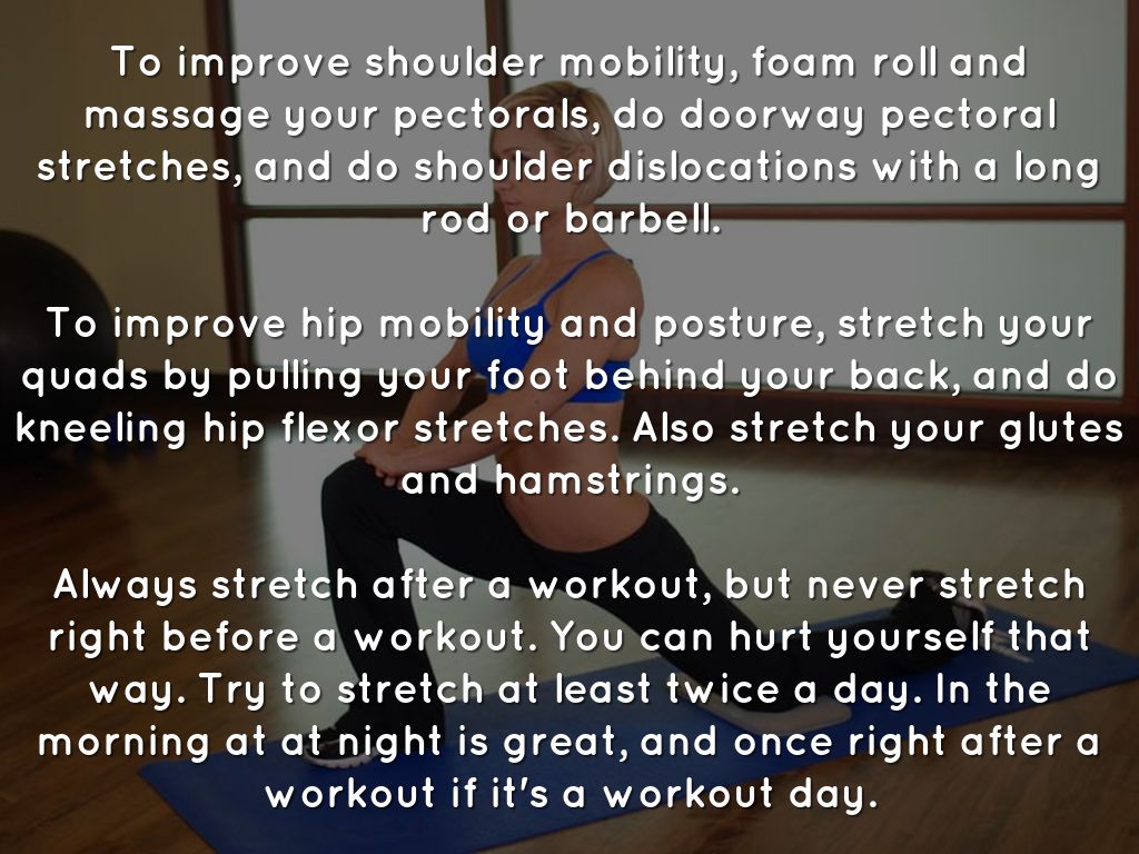 To improve hip mobility and posture, stretch your quads by pulling your foot behind your back, and do kneeling hip flexor stretches. Also stretch your glutes and hamstrings.