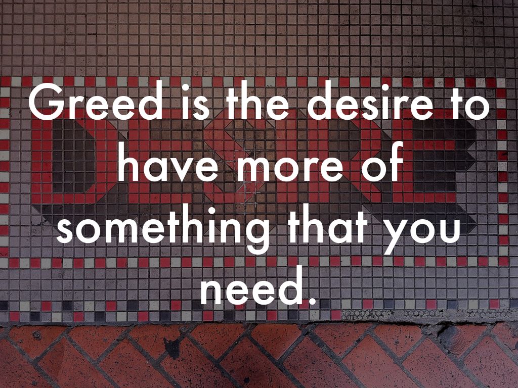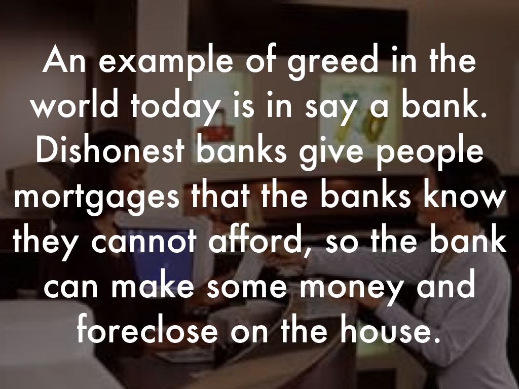 An example of greed in the world today is in say a bank. Dishonest banks give people mortgages that the banks know they cannot afford, so the bank can make some money and foreclose on the house.