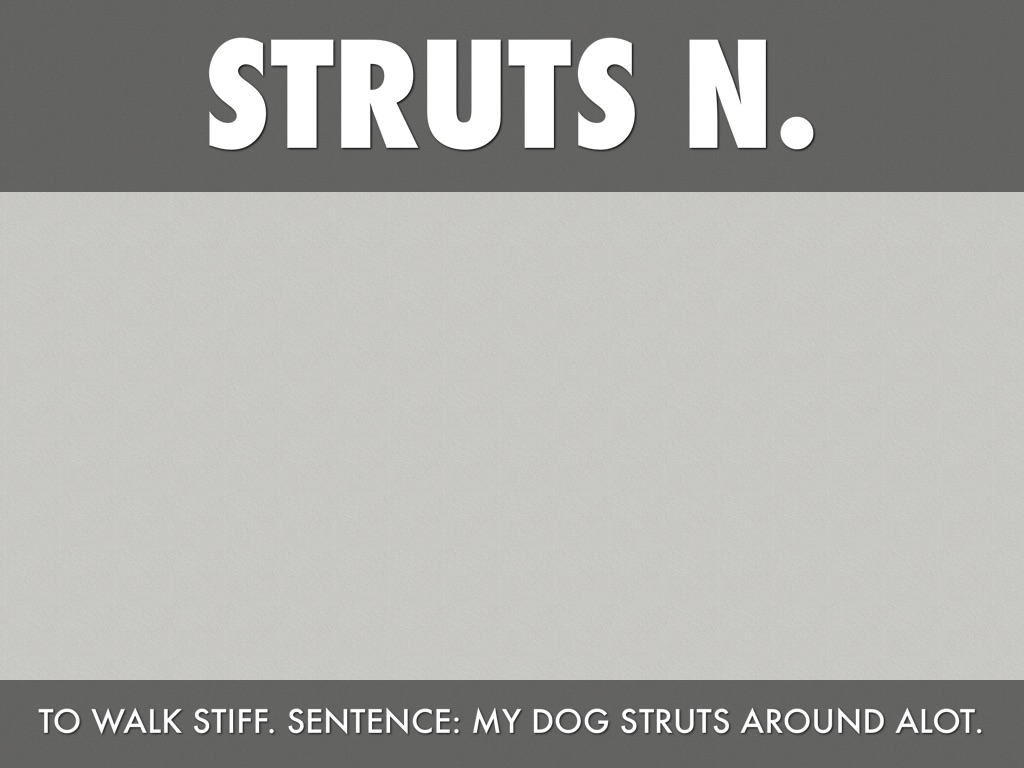 TO WALK STIFF. SENTENCE: MY DOG STRUTS AROUND ALOT.