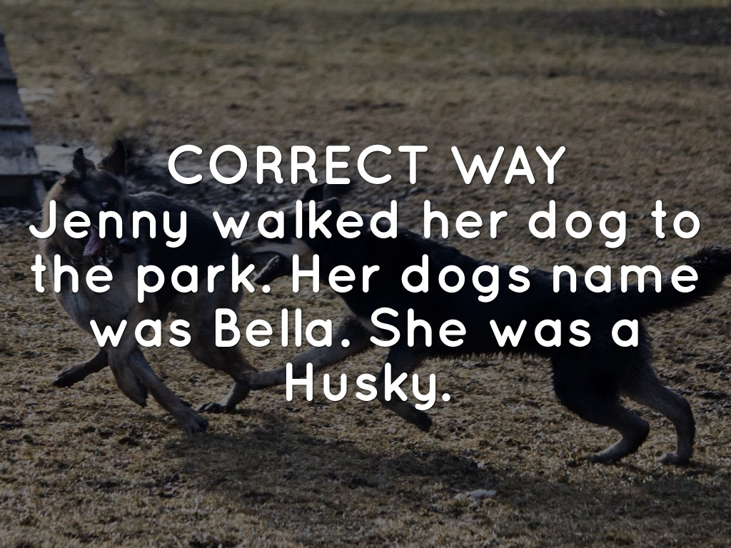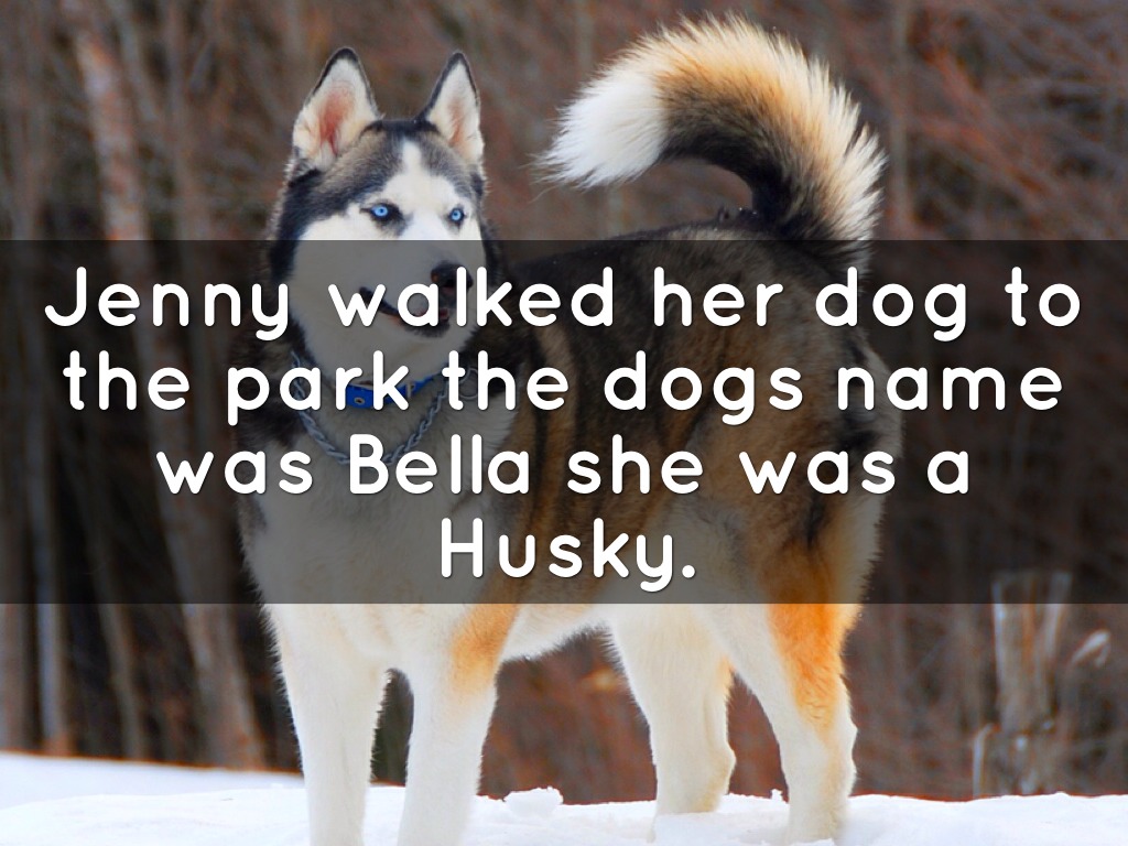 Jenny walked her dog to the park the dogs name was Bella she was a Husky.