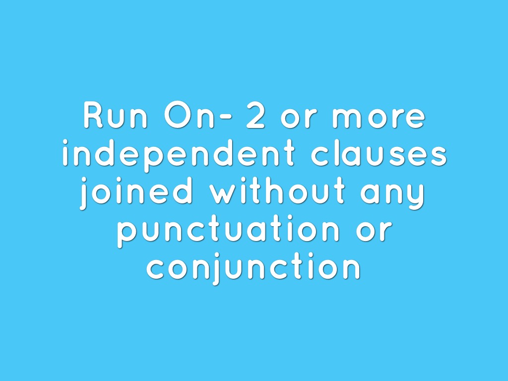 Run On- 2 or more independent clauses joined without any punctuation or conjunction