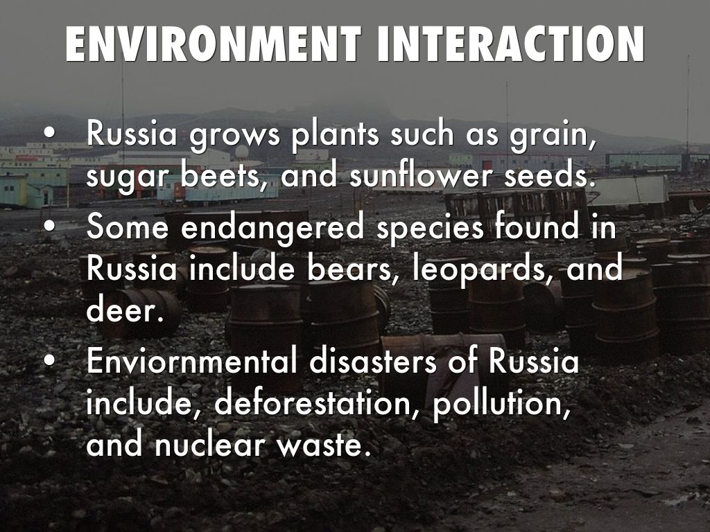 Enviornmental disasters of Russia include, deforestation, pollution, and nuclear waste.