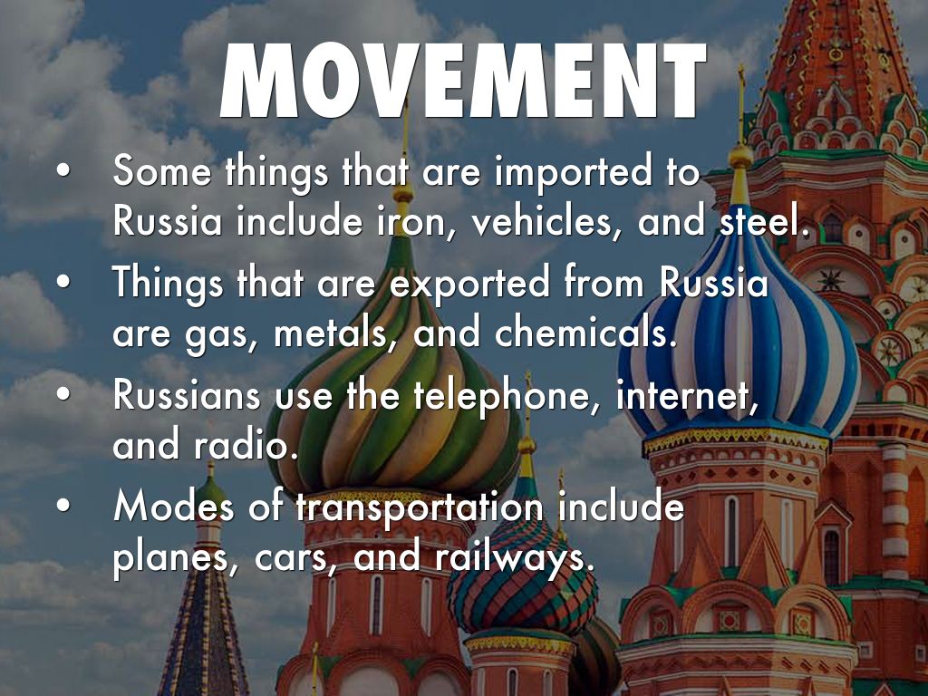 Some things that are imported to Russia include iron, vehicles, and steel.