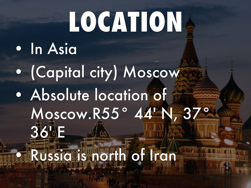 Absolute location of Moscow.R55° 44' N, 37° 36' E