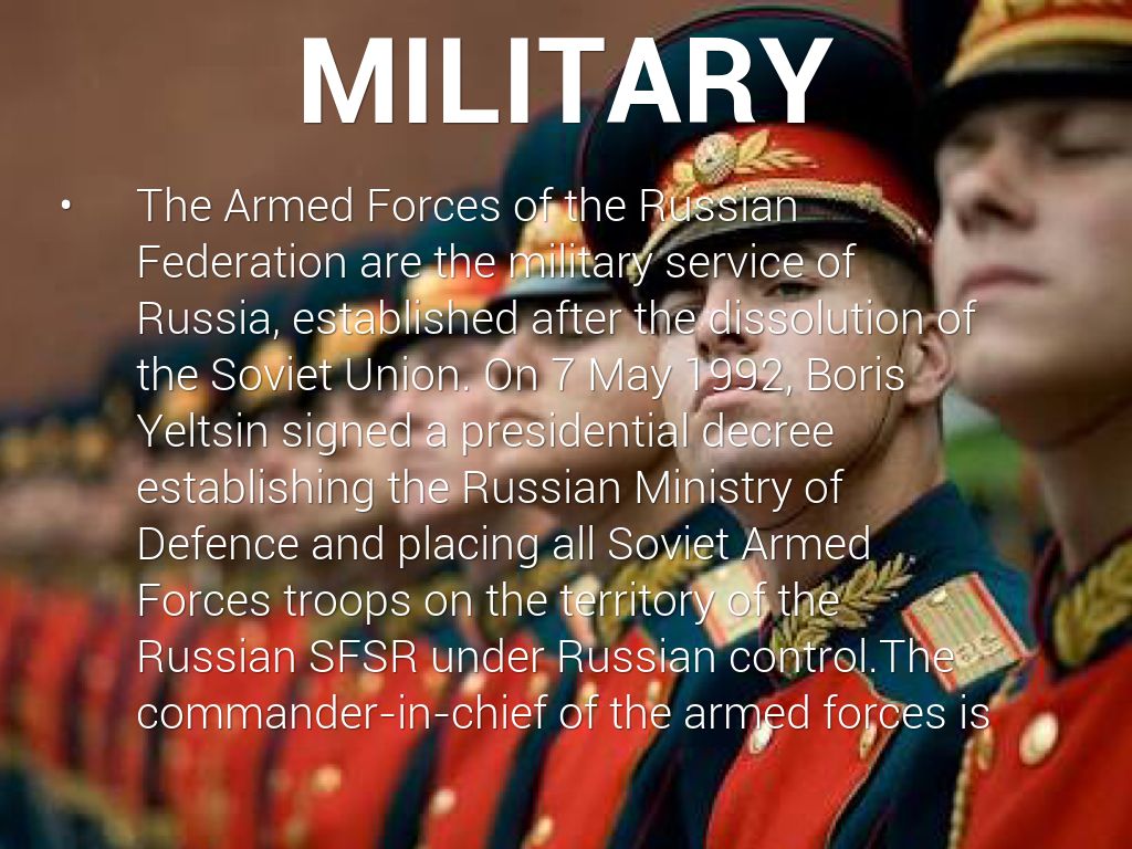 The Armed Forces of the Russian Federation are the military service of Russia, established after the dissolution of the Soviet Union. On 7 May 1992, Boris Yeltsin signed a presidential decree establishing the Russian Ministry of Defence and placing all Soviet Armed Forces troops on the territory of the Russian SFSR under Russian control.The commander-in-chief of the armed forces is the president of Russia. Although the Russian armed forces were formed in 1992, the Russian military dates its roots back to the times of the Kievan Rus'.