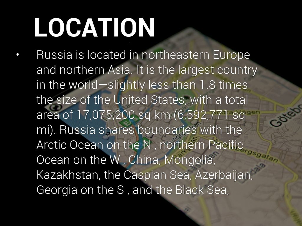 Russia is located in northeastern Europe and northern Asia. It is the largest country in the world—slightly less than 1.8 times the size of the United States, with a total area of 17,075,200 sq km (6,592,771 sq mi). Russia shares boundaries with the Arctic Ocean on the N , northern Pacific Ocean on the W , China, Mongolia, Kazakhstan, the Caspian Sea, Azerbaijan, Georgia on the S , and the Black Sea, Ukraine, Belarus, Latvia, Estonia, Finland on the W with a total land boundary of 19,990 km (12,421 mi) and a coastline of 37,653 km (23,396 mi). Russia's capital city, Moscow, is located in the eastern part of the country.
