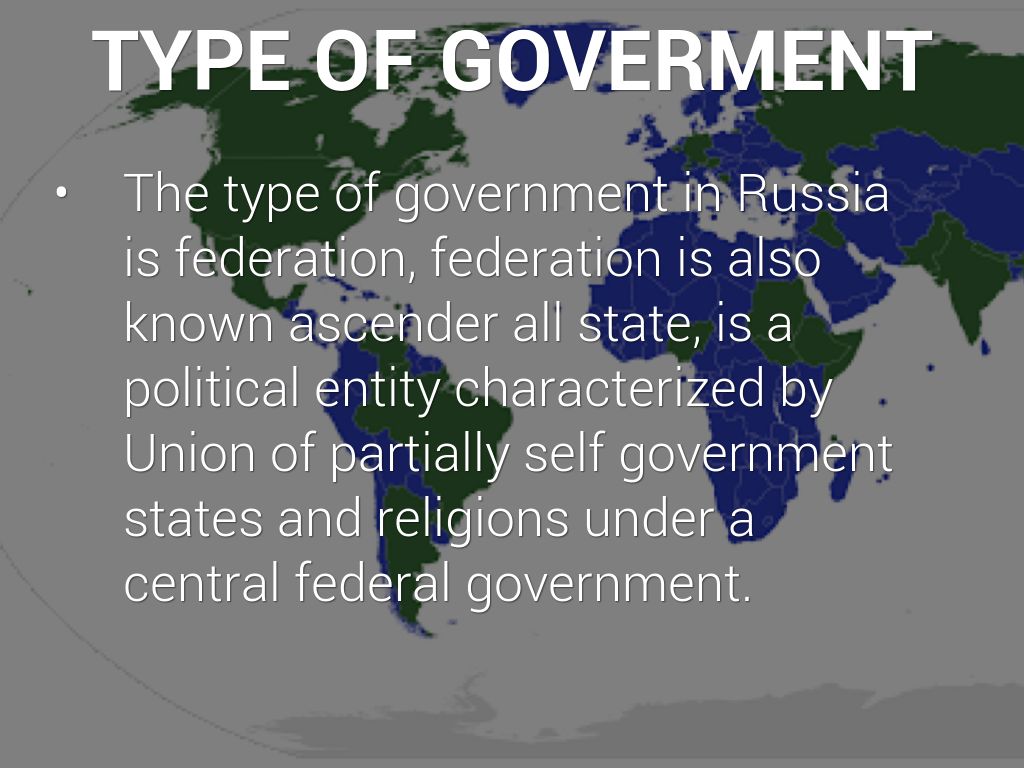 The type of government in Russia is federation, federation is also known ascender all state, is a political entity characterized by Union of partially self government states and religions under a central federal government.
