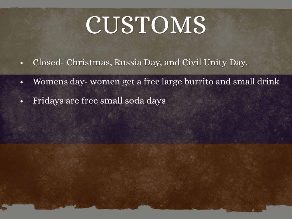 Closed- Christmas, Russia Day, and Civil Unity Day.