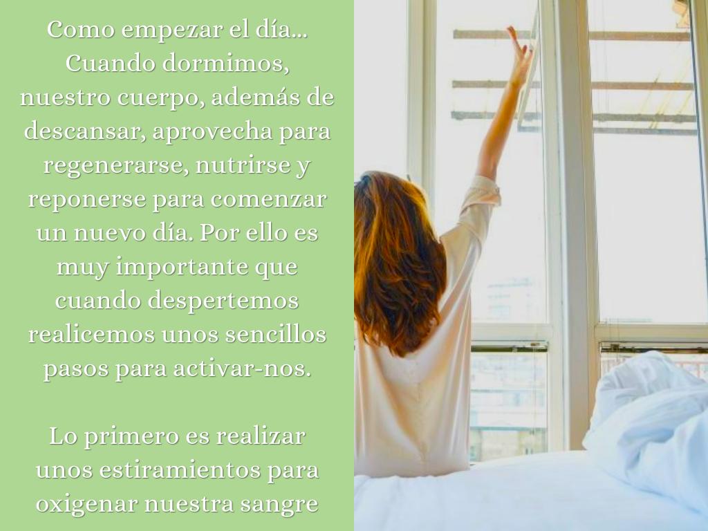 Cuando dormimos, nuestro cuerpo, además de descansar, aprovecha para regenerarse, nutrirse y reponerse para comenzar un nuevo día. Por ello es muy importante que cuando despertemos realicemos unos sencillos pasos para activar-nos.