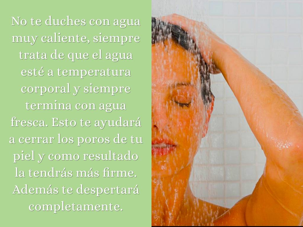 No te duches con agua muy caliente, siempre trata de que el agua esté a temperatura corporal y siempre termina con agua fresca. Esto te ayudará a cerrar los poros de tu piel y como resultado la tendrás más firme. Además te despertará completamente.