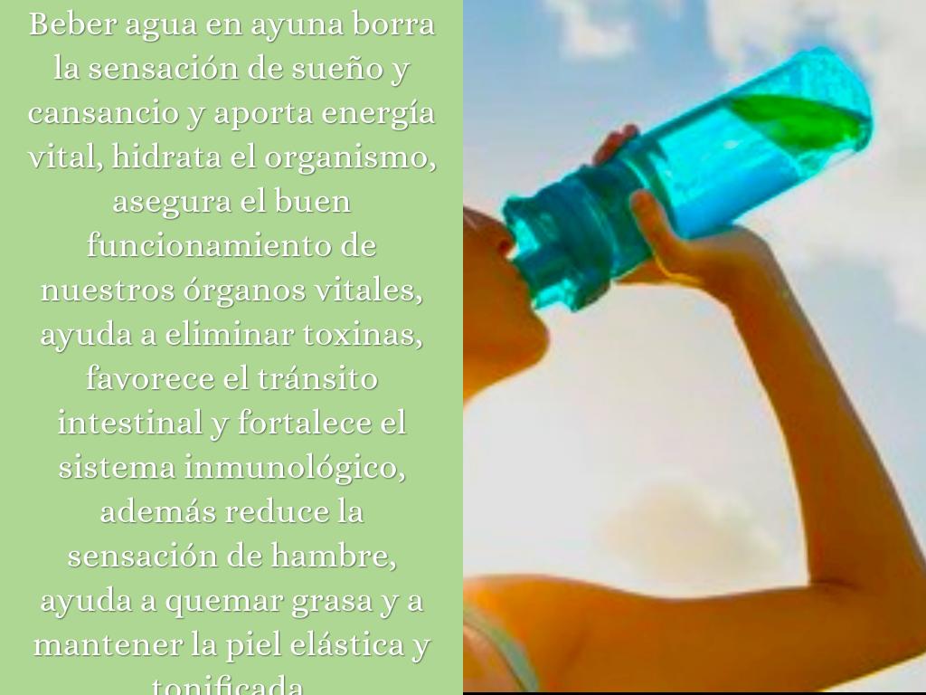Beber agua en ayuna borra la sensación de sueño y cansancio y aporta energía vital, hidrata el organismo, asegura el buen funcionamiento de nuestros órganos vitales, ayuda a eliminar toxinas, favorece el tránsito intestinal y fortalece el sistema inmunológico, además reduce la sensación de hambre, ayuda a quemar grasa y a mantener la piel elástica y tonificada.